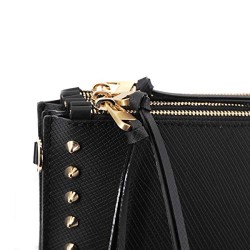 Pochette di manifattura italiana misura media in vinile satinato nero. Fantasia Satin stud con borchie lungo il perimetro frontale e logo GUM applicate sul fronte. Tre scomparti con chiusura con cerniera in nikel e tira zip in nikel. Ganci in nikel per tracolla applicati lateralmente. Lunghezza tracolla: 105 cm fino a 130 cm. Custodia protettiva. Composizione: PVC Dimensioni: 21 x 14 x 5 cm